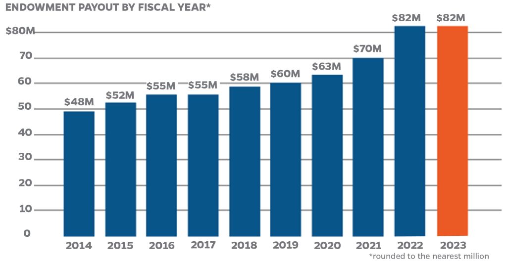 The university has strategically chosen to invest in Advancement through fees aligned with fundraising activities. A one-time fee of 5% is assessed on all new gifts. This fee is accrued in the spendable fund to avoid eroding the endowment principal and is paid down using up to 50% of spending transfers — allowing the endowment to begin making an impact with the first spending transfer. In addition, there is an annual administrative fee of 1.35% of each endowment’s spending base. For every $1 contributed to the endowment, the university receives a return on investment of about $9 over time.