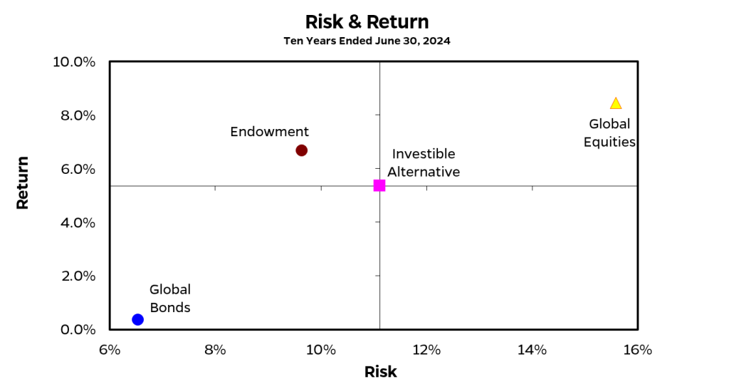 Investment performance results are benchmarked against a composite including 70% MSCI (Morgan Stanley Capital International) All Country World Index and 30% Barclays Global Aggregate Bond Index as well as CPI (the consumer price index) +5%. The UF endowment returned 7.2% for the 2024 fiscal year, and it significantly exceeded the investible benchmark return for the 5-, 10- and 15-year time periods. As shown on the accompanying graph, for the ten-year period relative to the investible alternative benchmark, the endowment has outperformed by 1.2% annually while realizing less than 90% of the benchmark’s volatility.